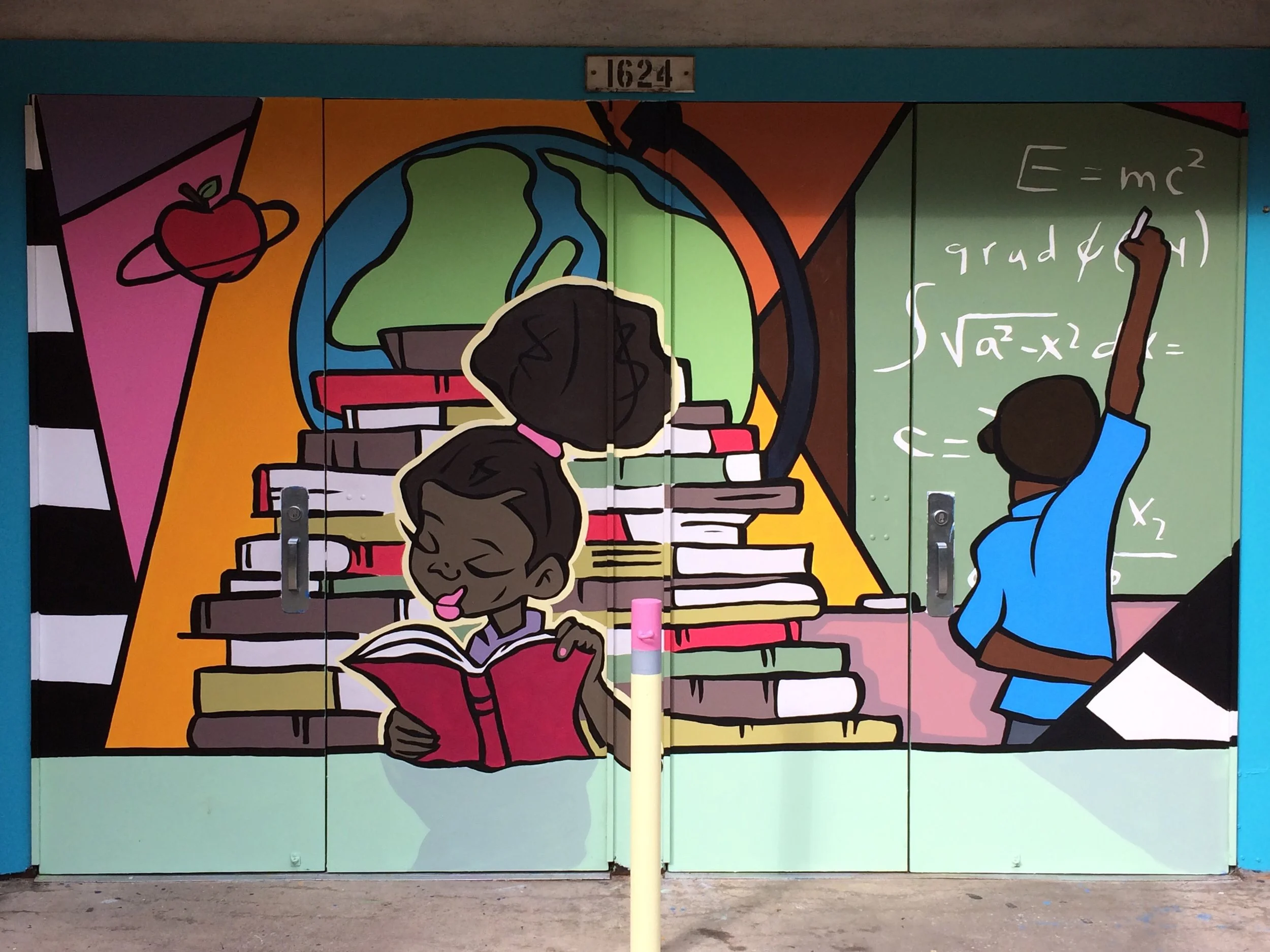 If you've driven by Eutaw-Marshburn Elementary School, you may have noticed a distinct change to front of the building - a beautiful mural on the front doors. Made possible by the T. Rowe Price Foundation and collaboration with the Jubilee Arts Center, the mural was conceptualized and led by illustrator Megan Lewis1. Titled "If you want it, it's already yours," she hopes that the mural will inspire incoming students. "Before the students stepped inside the school I wanted them to be visually boosted with a self reflecting, inspiring, and colorful image." To complete the piece, she was assisted by Tamyaja Johnson, Kristian Tyson, Taliayah Thorne, and Ka'Nyrah Wilson, students at EMES.