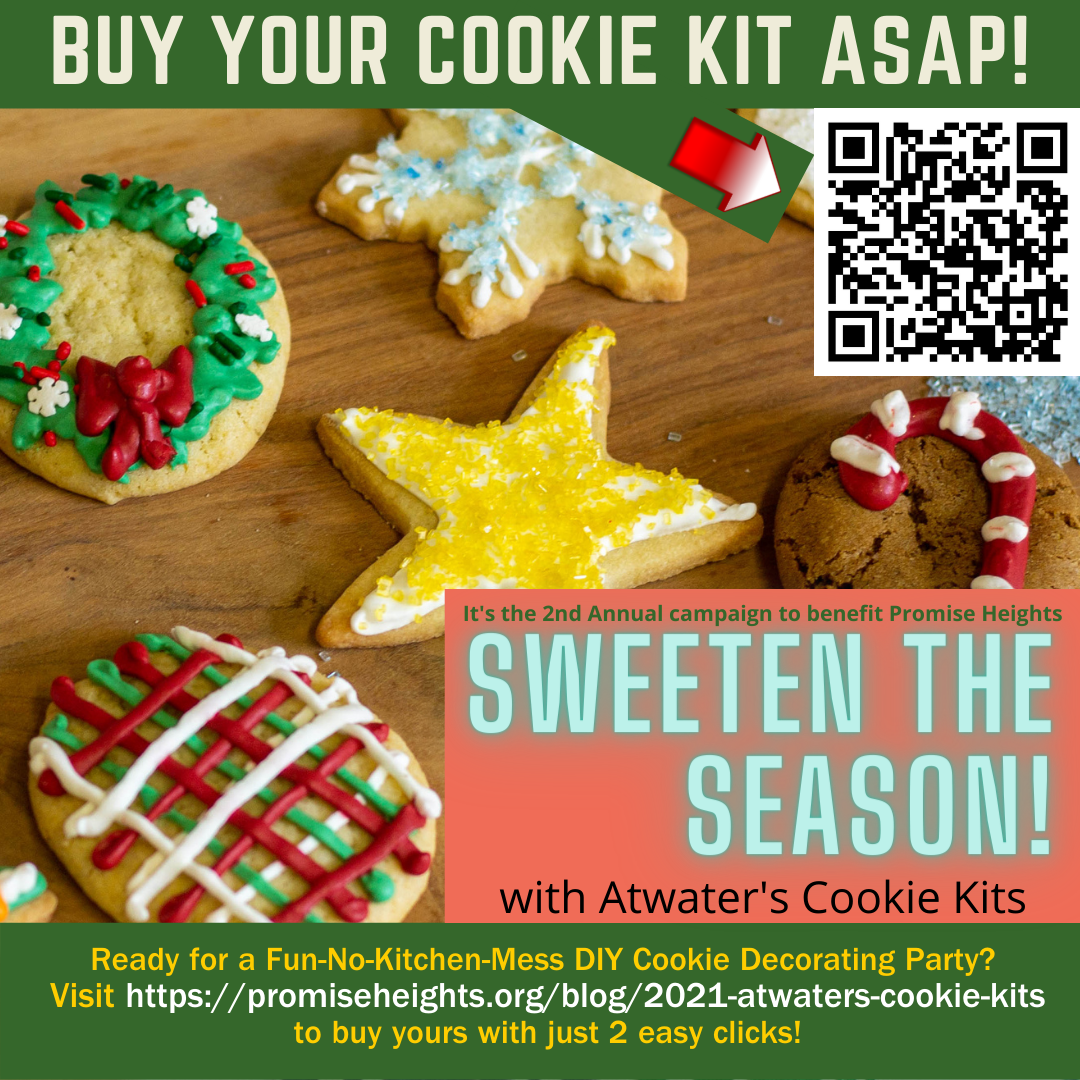 You and your family can decorate the cookies as you please. plus you’ll have that great feeling knowing you’re supporting the Promise Heights team as they work in the community during the coming winter months. Atwater’s founder and owner, Ned Atwater, has generously arranged that your purchase of the Atwater’s cookie decorating kit will result in a $5 donation to Promise Heights to help expand our efforts during the coming winter months.