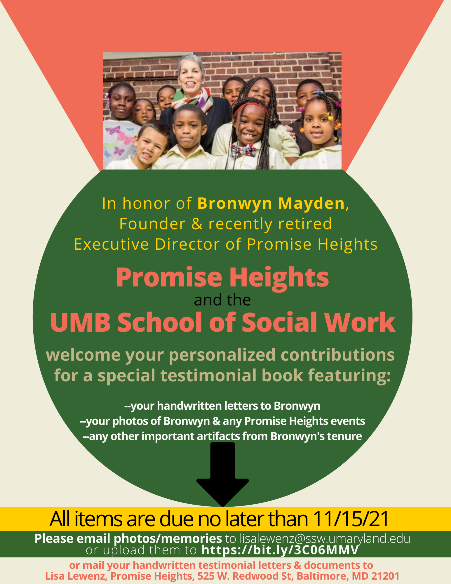 We hope you're in the know that in August, Dean Judy L. Postmus of the UMB School of Social Work announced Bronwyn Mayden’s upcoming retirement plans. As the visionary Founder and Executive Director of the highly successful Promise Heights Initiative, for more than a decade, Bronwyn and her team consistently delivered impactful, ground-breaking, and generational change to countless families in West Baltimore and beyond.